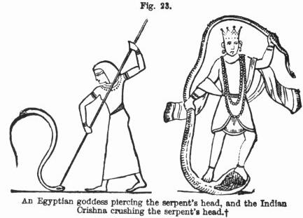 Fixed on the writhing monster's burnished crest."The constellation thus represented is commonly known by the name of "The Kneeler," from this very description of the Greek poet; but it is plain that, as "Eugonasis" came from the Babylonians, it must be interpreted, not in a Greek, but in a Chaldee sense, and so interpreted, as the action of the figure itself implies, the title of the mysterious sufferer is just "The Serpent-crusher." Sometimes, however the actual crushing of the serpent was represented as a much more easy process; yet, even then, death was the ultimate result; and that death of the serpent-destroyer is so described as to leave no doubt whence the fable was borrowed. This is particularly the case with the Indian god Crishna, to whom Wilkinson alludes in the extract already given. In the legend that concerns him, the whole of the primeval promise in Eden is very strikingly embodied. First, he is represented in pictures and images with his foot on the great serpent's head, and then, after destroying it, he is fabled to have died in consequence of being shot by an arrow in the foot; and, as in the case of Tammuz, great lamentations are annually made for his death. Even in Greece, also, in the classic story of Paris and Achilles, we have a very plain allusion to that part of the primeval promise, which referred to the bruising of the conqueror's "heel." Achilles, the only son of a goddess, was invulnerable in all points except the heel, but there a wound was deadly. At that his adversary took aim, and death was the result.