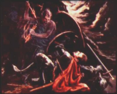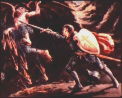 Then Apollyon, espying his opportunity, began to gather up close to Christian, and wrestling with him, gave him a dreadful fall; and with that Christian's sword flew out of his hand. Then said Apollyon, I am sure of thee now: and with that he had almost pressed him to death, so that Christian began to despair of life. But, as God would have it, while Apollyon was fetching his last blow, thereby to make a full end of this good man, Christian nimbly reached out his hand for his sword, and caught it, saying, Rejoice not against me, O mine enemy: when I fall, I shall arise, Mic. 7:8; and with that gave him a deadly thrust, which made him give back, as one that had received his mortal wound. Christian perceiving that, made at him again, saying, Nay, in all these things we are more than conquerors, through Him that loved us. Rom. 8:37. And with that Apollyon spread forth his dragon wings, and sped him away, that Christian saw him no more. James 4:7.